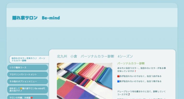 Be-mindは、パーソナルカラーアナリスト・西さんが主宰するカラーサロン。4シーズンに基づくパーソナルカラー診断を8,000円(税込)で提供しており、手軽な価格で自分に似合うカラーを知りたい方にぴったりです。