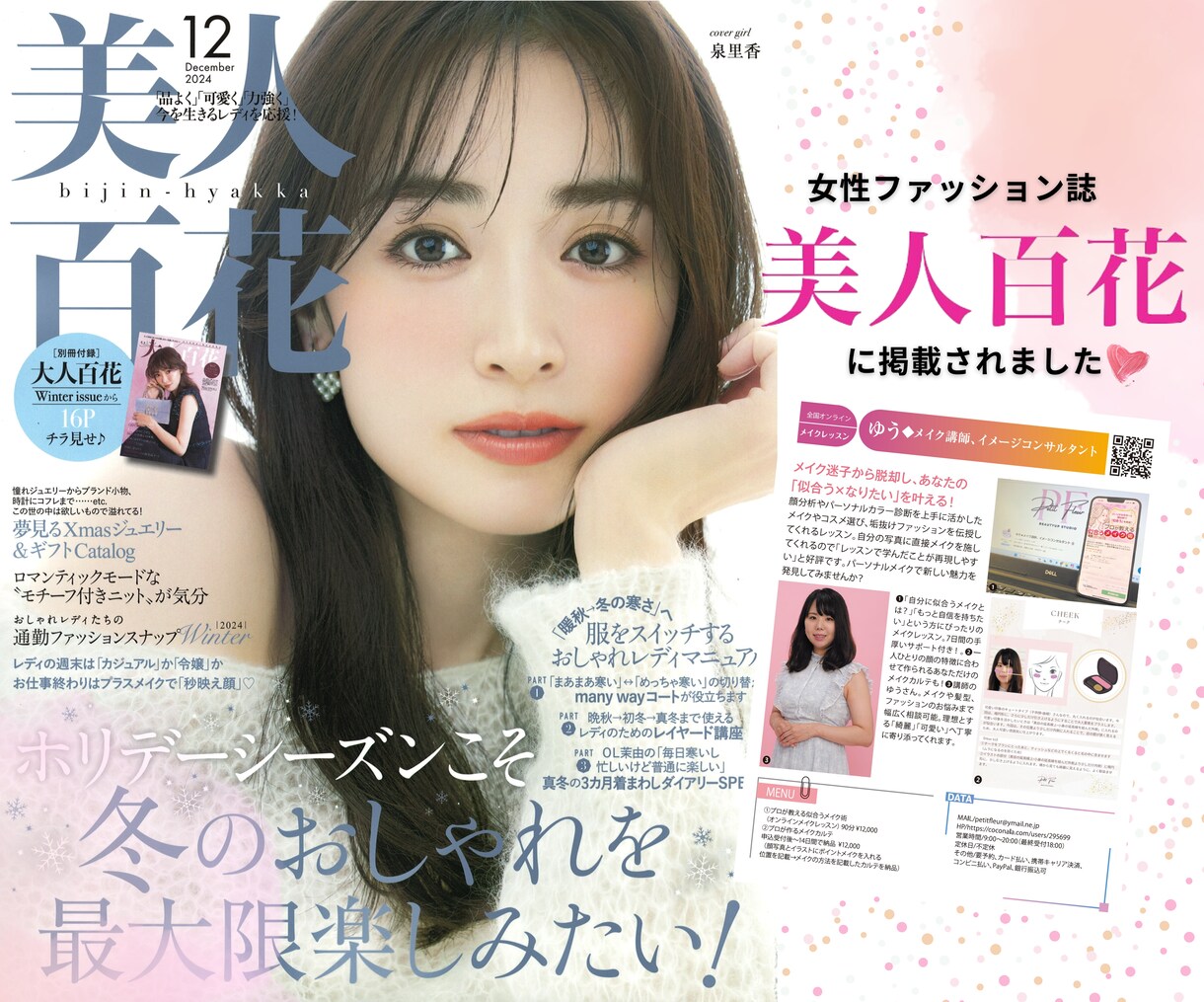 女性ファッション誌「美人百花」に掲載されたこともあるメイク講師YUUさんのメイクレッスンです。パーソナルカラー、顔タイプ診断、顔分析、似合うコスメ(ポイントメイク)、ヘアスタイルカルテ付きでさらにアフターフォロー付き(7日間)のため、トータルでの美の向上が見込めます。
