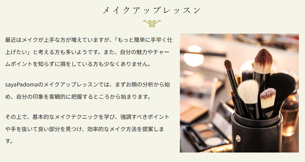 sayaPadomaは、神奈川県内で人気のメイクレッスンサロンです。専門サロンによる210分の濃密レッスンを11,000円(税込)で受講でき、パーソナルカラー診断を活かしたメイクを学びたい方におすすめです。